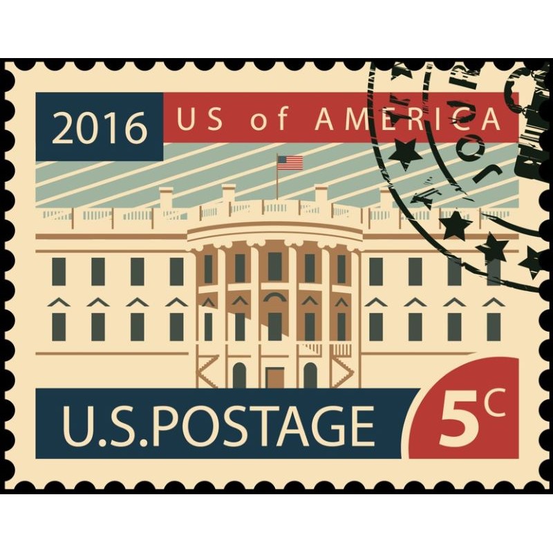 Sticker autocollant timbre maison blanche dans le theme USA, prédécoupé à la forme du visuel, pouvant être collé sur toutes surfaces lisses propres comme les murs, métal, vitre, plastique, etc.