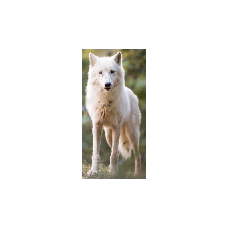 Sticker autocollant loup des neiges blanc dans le theme animaux banquise, prédécoupé à la forme du visuel, pouvant être collé sur toutes surfaces lisses propres comme les murs, métal, vitre, plastique, etc.