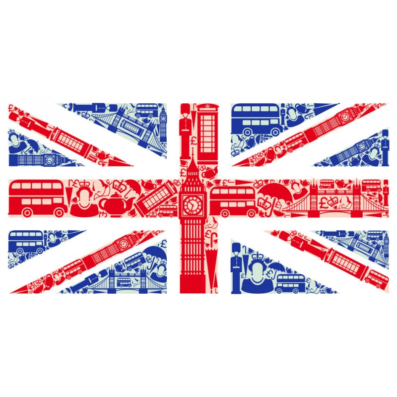 Sticker autocollant drapeau avec symbone anglais dans le theme London prédécoupé à la forme à coller sur toutes surfaces lisses et propres (plastique, métal, vitre, etc)