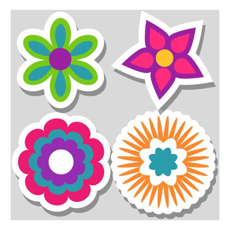 Sticker autocollant 4 fleurs hippies dans le theme peace and love. Adhesif prédécoupé à la forme du dessin, à coller sur surfaces lisses comme les murs, métal, vitre, plastique, etc.