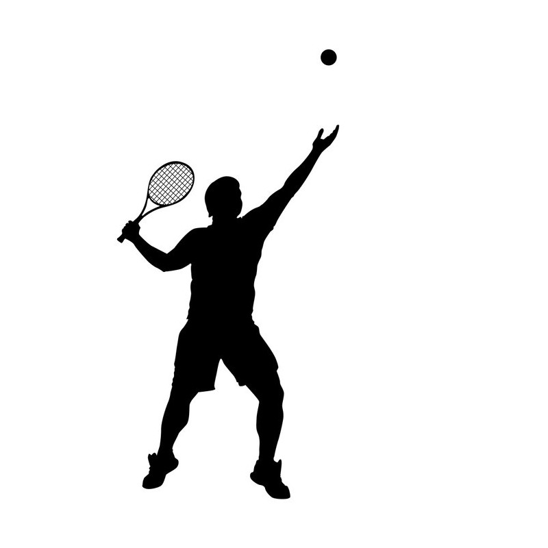 Sticker autocollant joueur de tennis dans le theme du tennis, prédécoupé à la forme du visuel, pouvant être collé sur toutes surfaces lisses propres comme les murs, métal, vitre, plastique, etc.